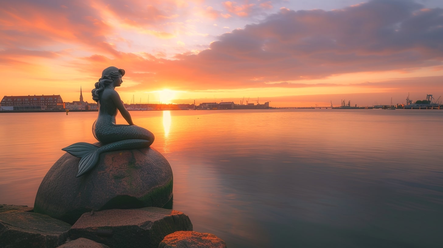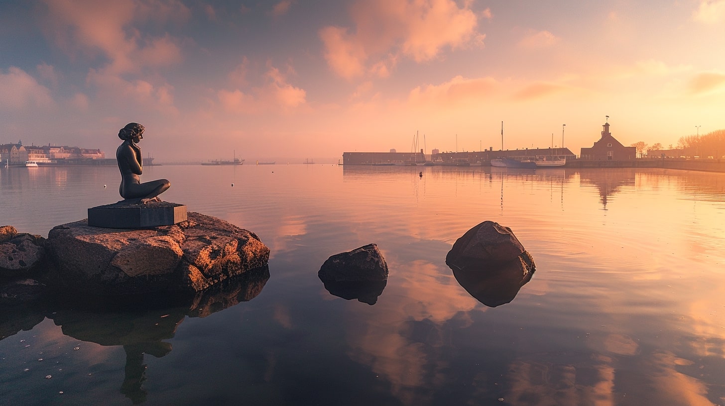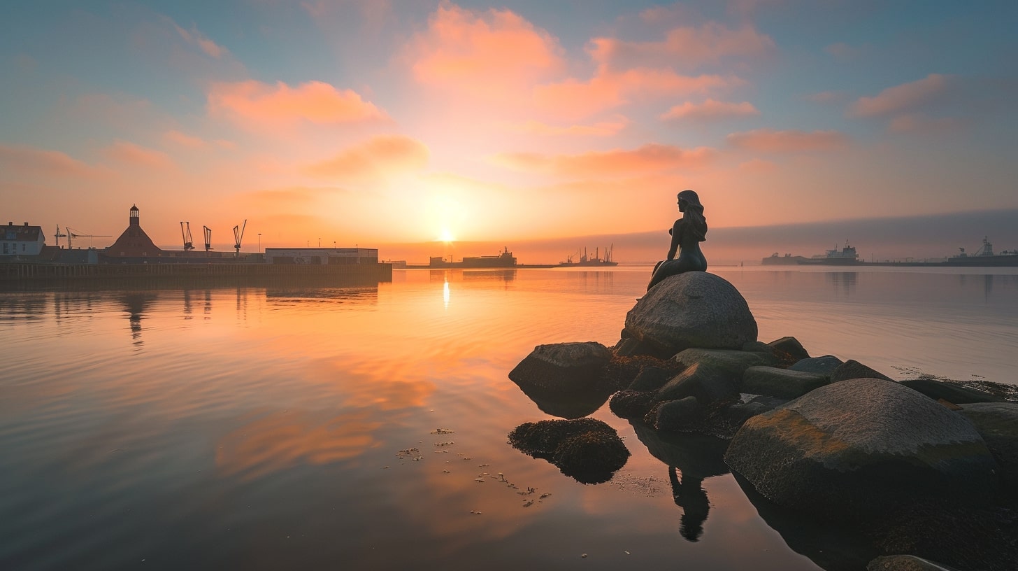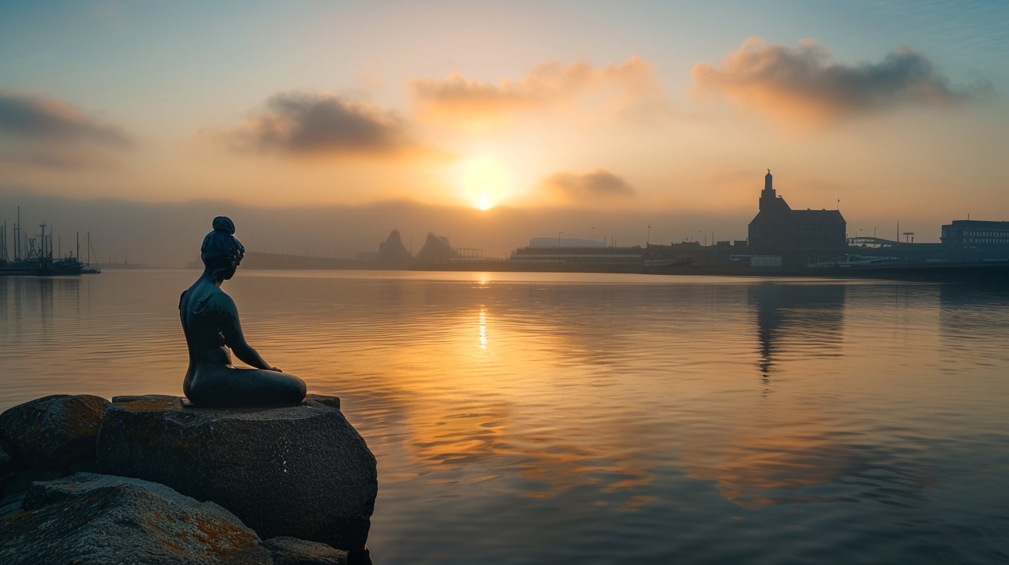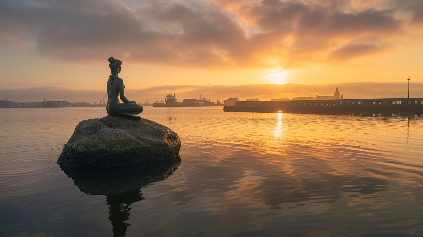 The Little Mermaid statue in Copenhagen, Denmark, captured at sunrise with a golden hue reflecting off the water, the statue sitting gracefully on a rock, surrounded by a calm harbor, professional landscape photography, Nikon D850, 24-70mm f/2.8 lens, ISO 100, f/8, 1/200s --ar 16:9