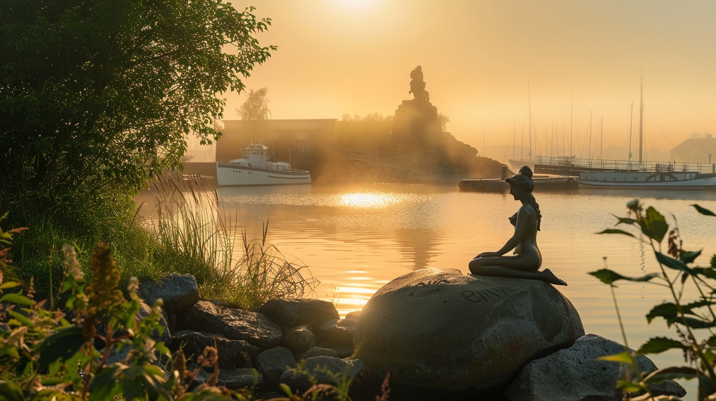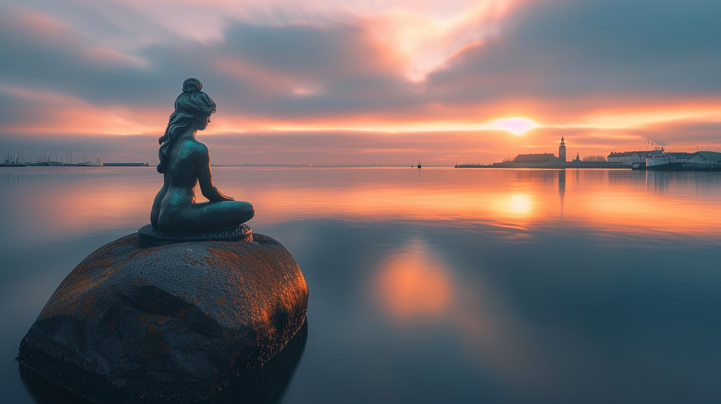 The Little Mermaid statue in Copenhagen, Denmark, captured at sunrise with a golden hue reflecting off the water, the statue sitting gracefully on a rock, surrounded by a calm harbor, professional landscape photography, Nikon D850, 24-70mm f/2.8 lens, ISO 100, f/8, 1/200s --ar 16:9