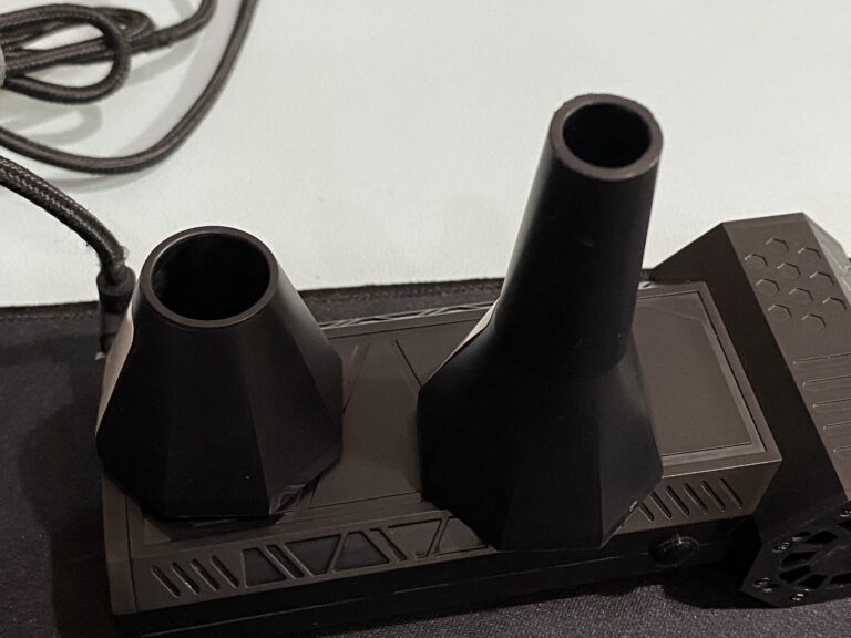 구매시 2가지 형태의 아답터인가? 전면부 자석 형태로 부착가능한 송풍기 노즐이 제공되는데, 하나는 짧고 일반적이고 하나는 길고 좁은 형태로 나오는 바람의 송풍을 좀더 집중시킬 수 있다.