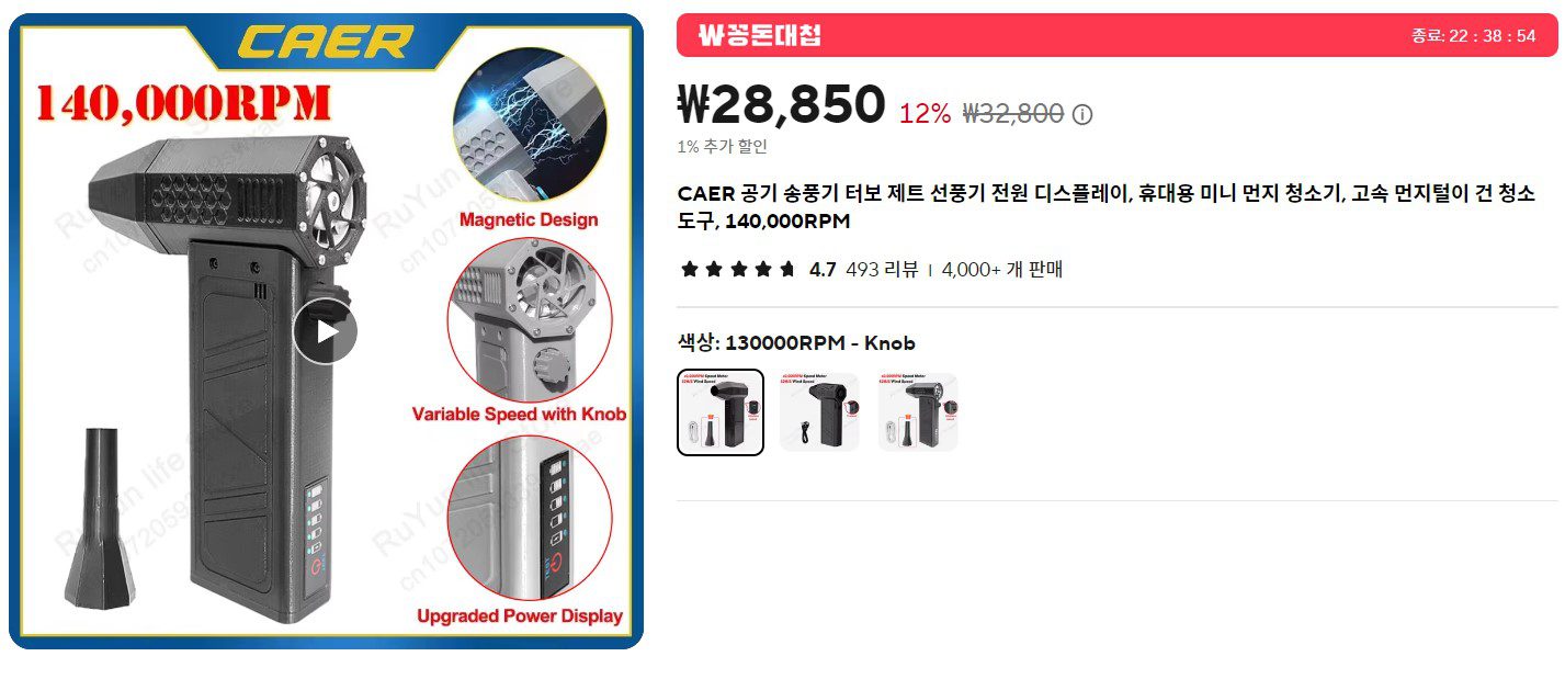 에어건 정도의 송풍 능력에 세차후 물기 불어내는 용도나, 각종 컴퓨터 내부 청소 및 사용 용도가 많아 탐나던 제품이긴 했지만, 가격이 조금 사악했었다.