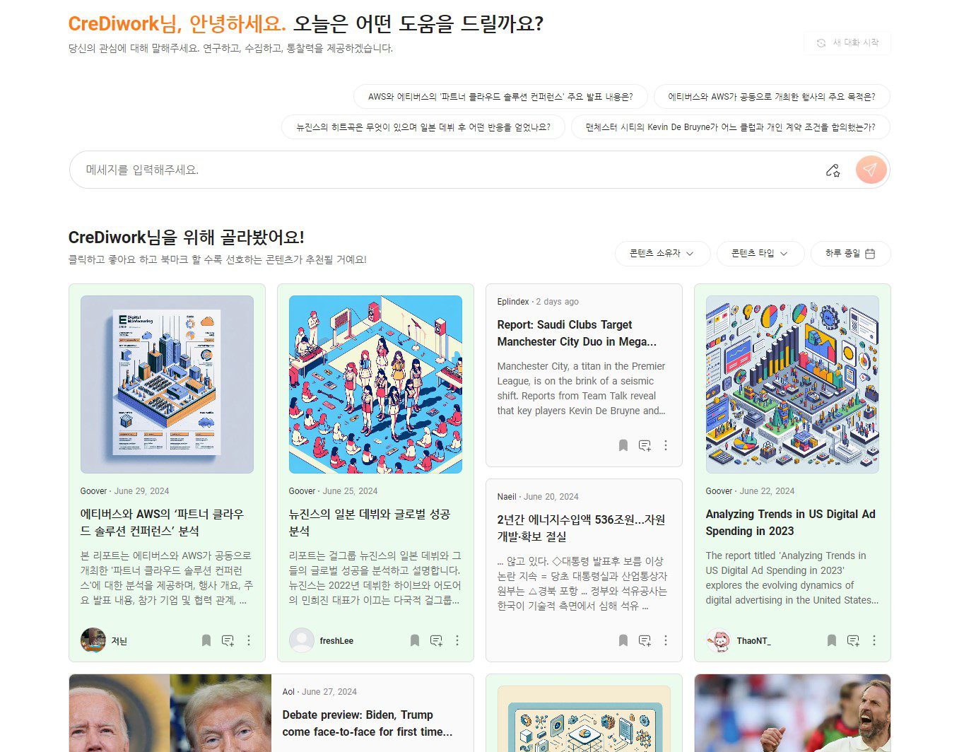 - 사용자가 지속적으로 모니터링하고 싶은 주제에 대해 ‘브리핑 페이지’를 개설할 수 있습니다. 이 페이지는 관련 뉴스, 소셜 미디어 반응, 인용문, 관련 인물 및 기업 정보 등을 카드뉴스 형태로 제공합니다.