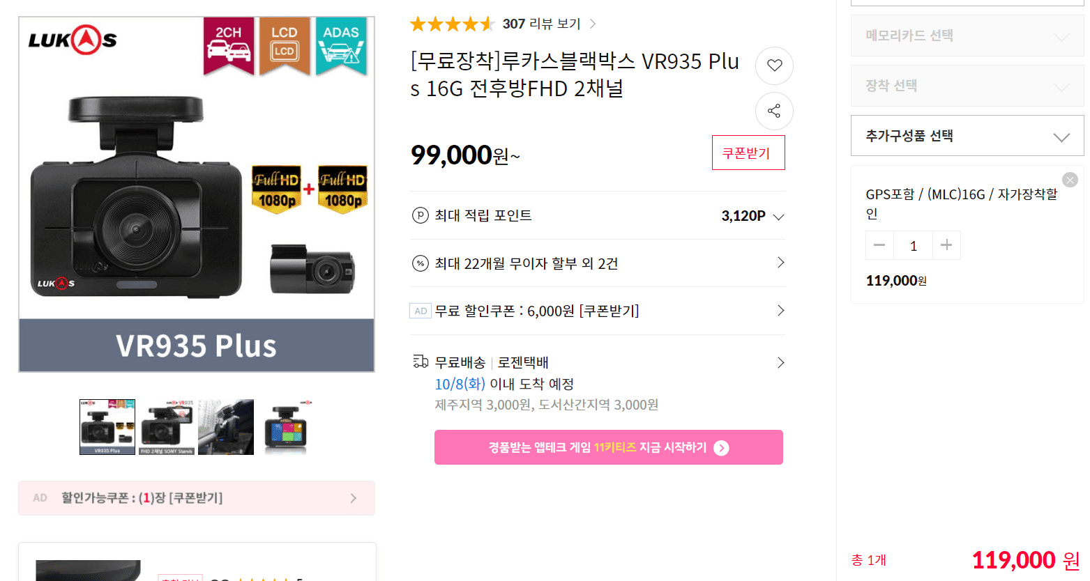 [11번가] [무료장착]루카스블랙박스 VR935 Plus 16G 전후방FHD 2채널