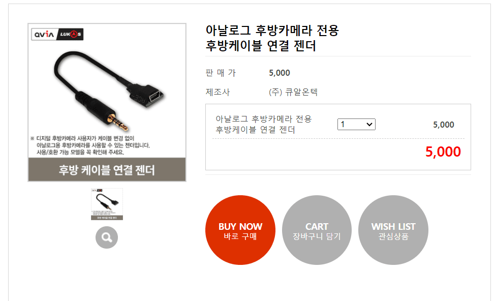 근데, 이제품은 후방카메라 연결 방식이 아날로그여서, 후방카메라 연결 젠더를 구매해야 한다.