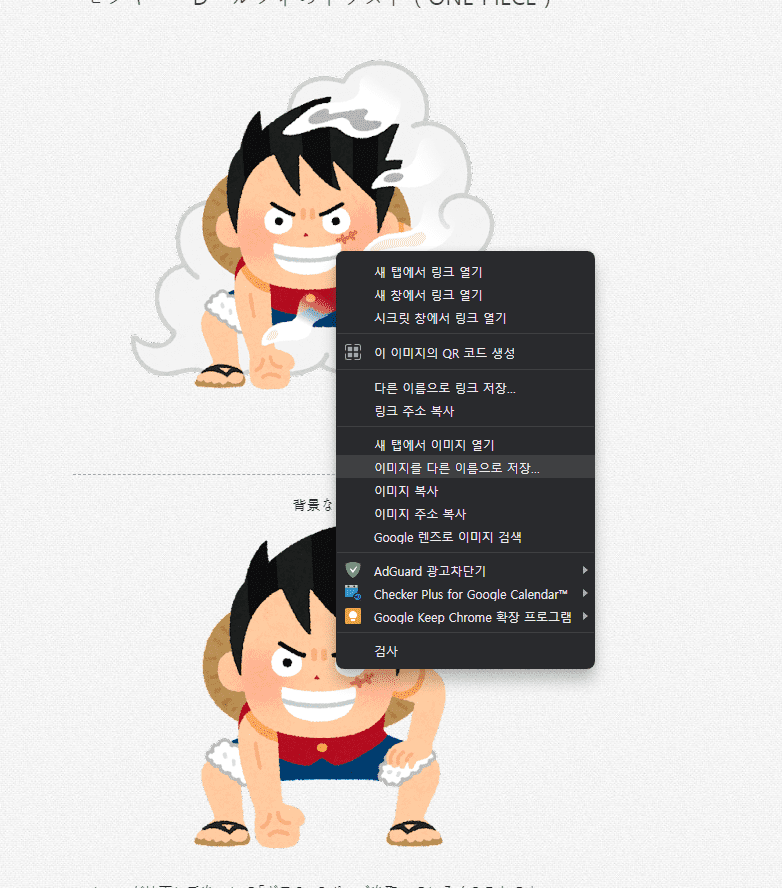 원하는 이미지 위에 마우스 오른쪽 버튼을 눌러 [이미지를 다른 이름으로 저장]을 선택하면 배경이 투명한 png 파일 형태로 저장이 됩니다.