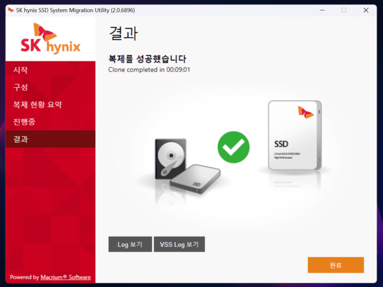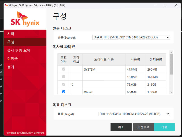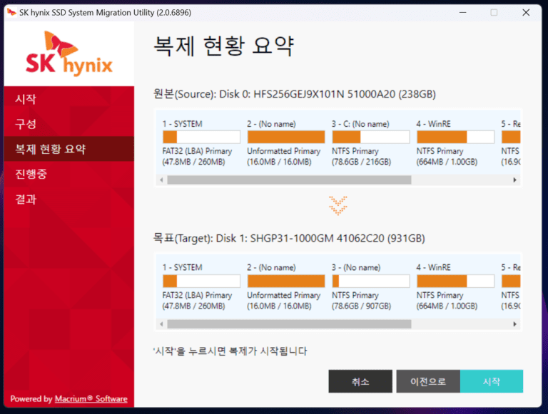 이후에는 다시 조립 후 윈도우 부팅한 뒤에 하이닉스 전용 마이그레이션 전용 툴 프로그램을 설치한뒤 기존 C드라이브를 새로 장착한 SSD로 넘겨 주면 된다.