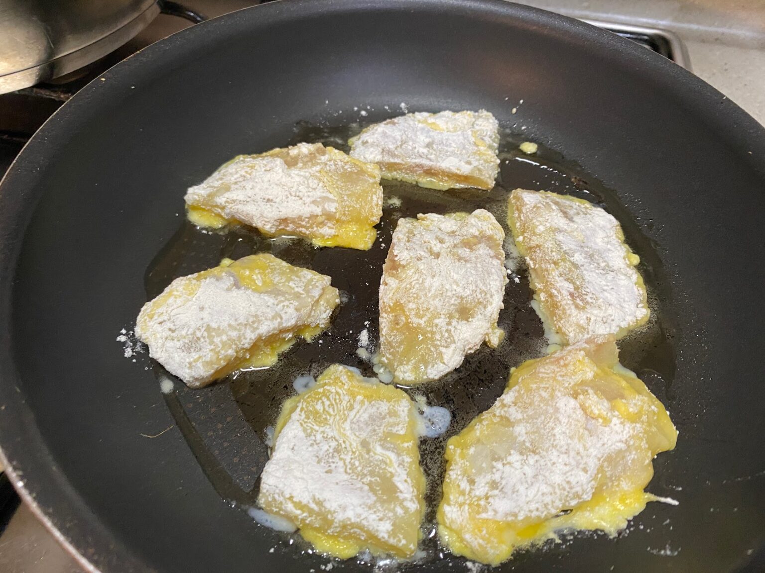 계란물과 튀김가루를 묻혀서 하나씩 부치기 시작했다!