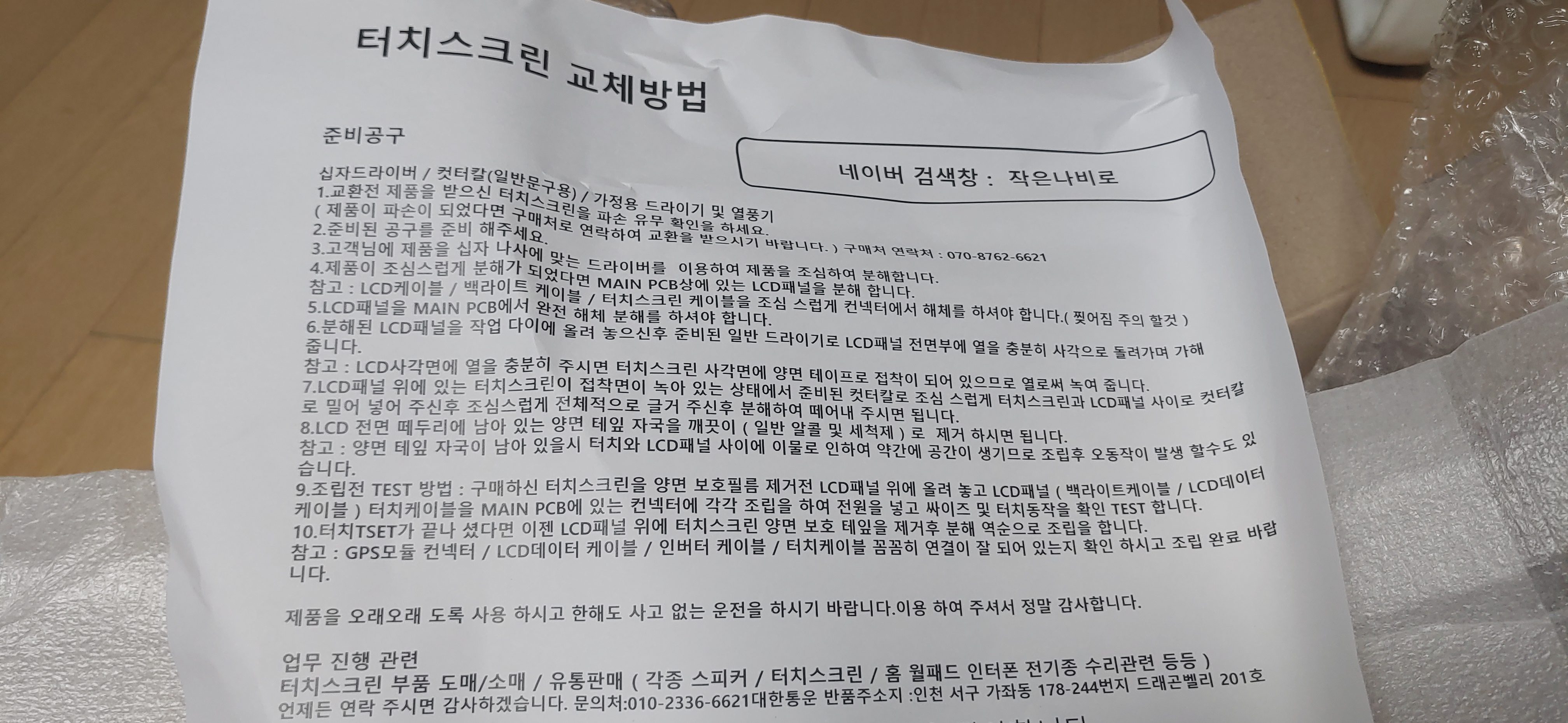 새로운 터치패널 비닐을 벗기고 액정에 붙여주고 분리한 순서 반대로 조립을 한뒤 전원을 켜면 됩니다.