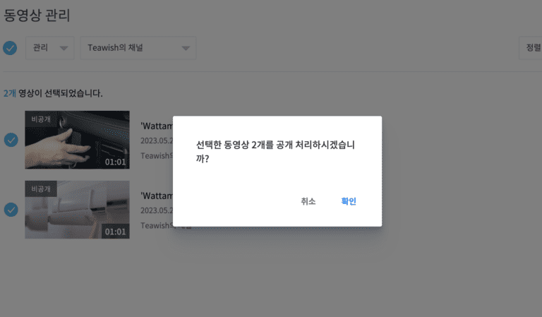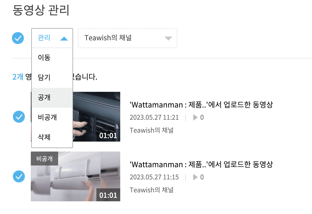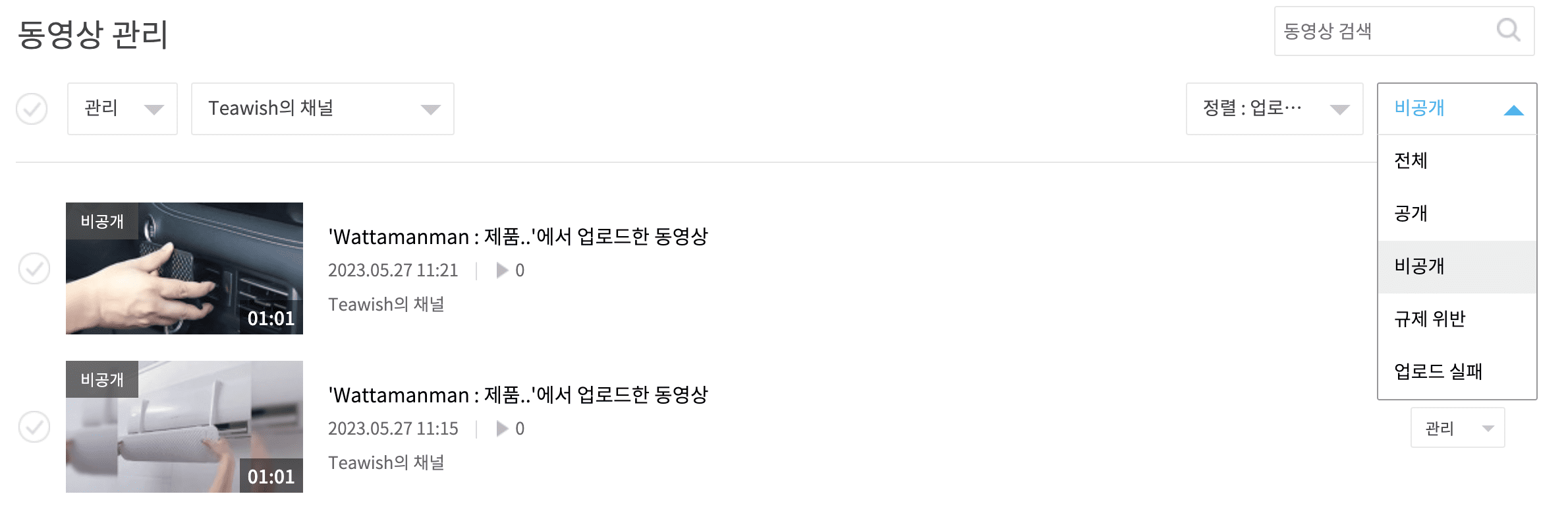 로그인후 내 채널 동영상 관리에서 비공개 영상을 소팅 한 후