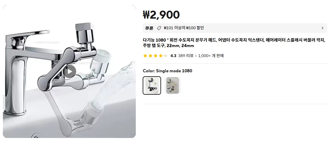 그래서, 수전 필터 부분을 바꾸어 볼까? 하다가 알리에서 몇 천원에 파는 회전 익스텐더를 설치해 보고 괜찮으면 좋은 것으로 바꾸어 보려 주문후 설치했다.