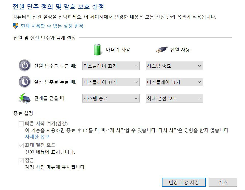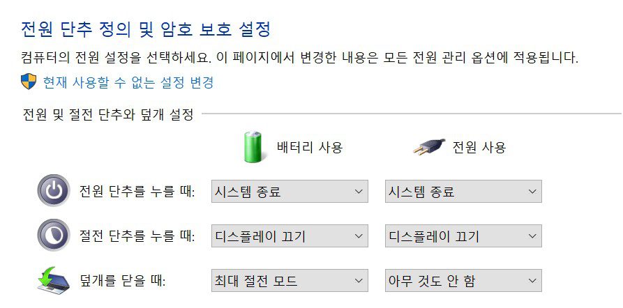 그러면 아래와 같이 덮개를 닫았을때 동작을 내가 원하는 대로 설정할 수 있다.