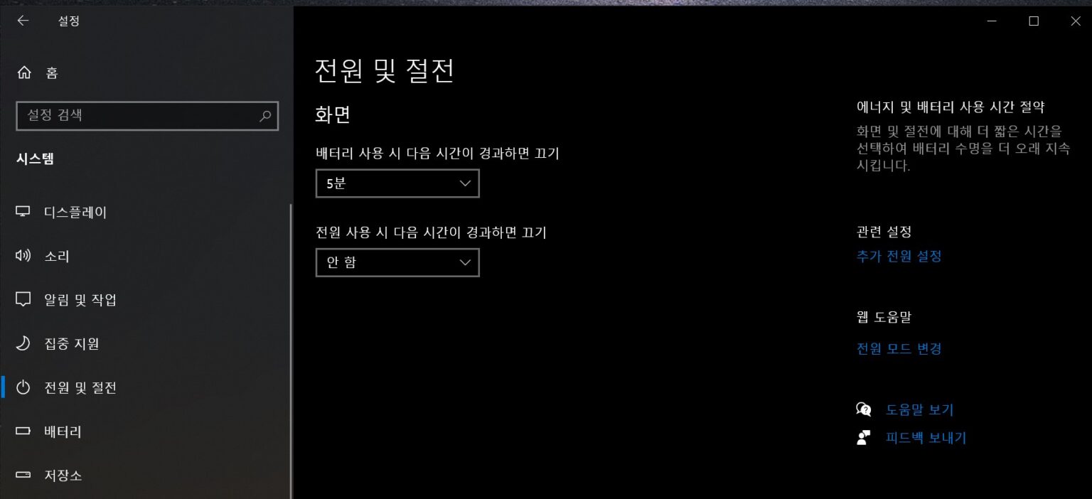 아마, 대부분 [최대 절전 모드]가 되어 있을듯 하다.