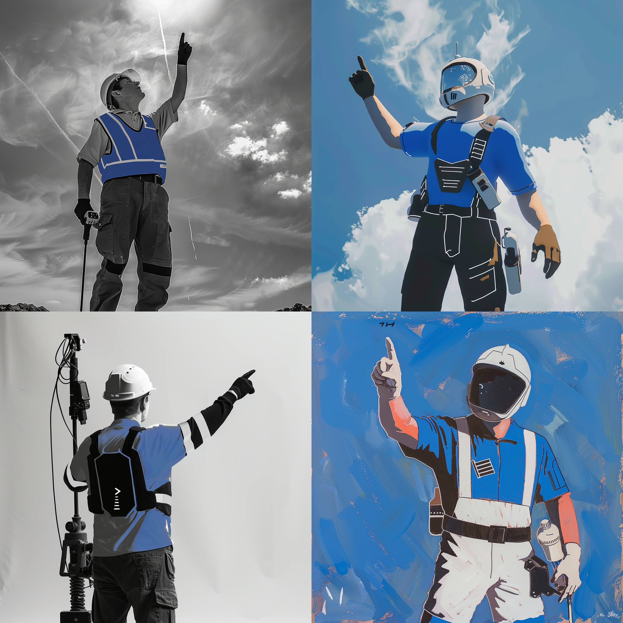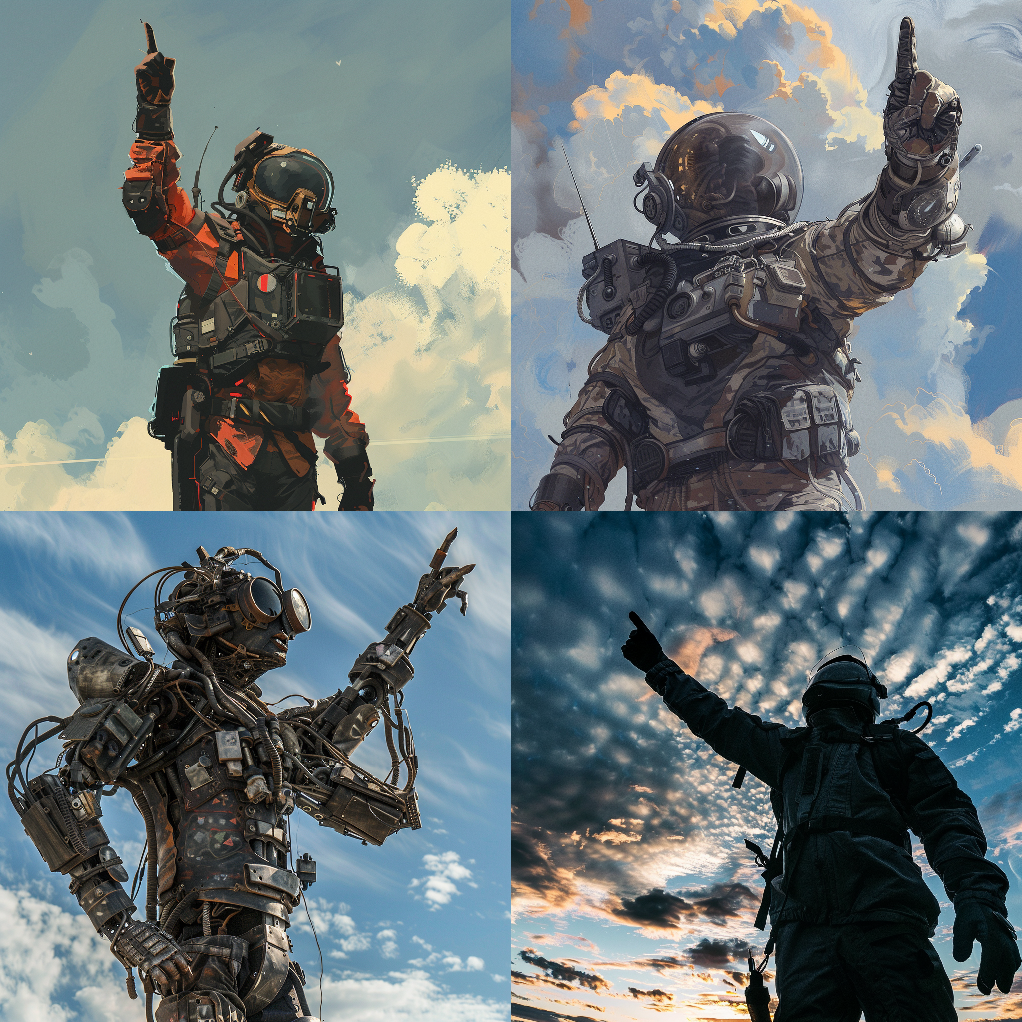 Frontal view, standing up and facing the sky, right hand pointing to the sky, left hand holding equipment –cref https://s.mj.run/NrZbJSdj-kA –v 6.0