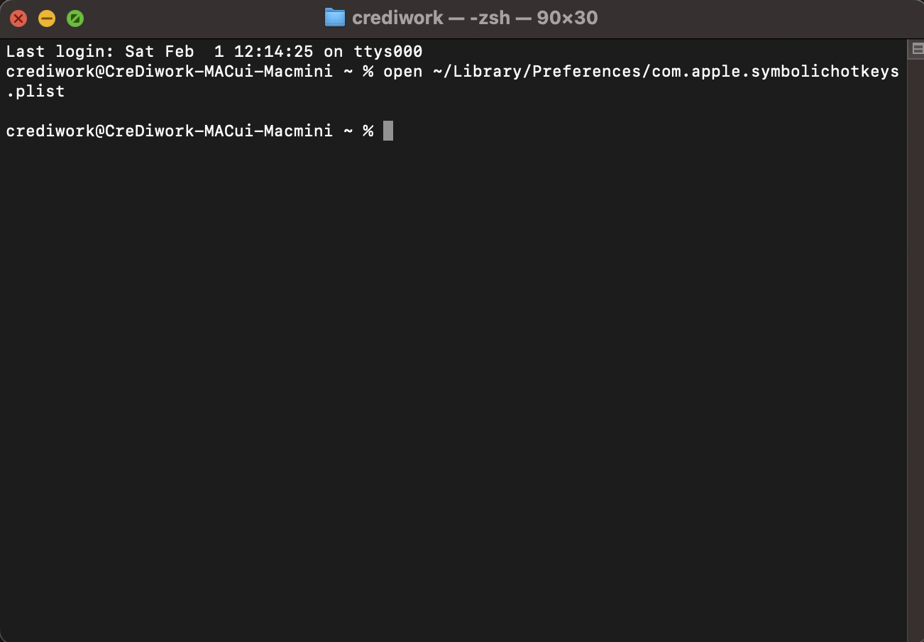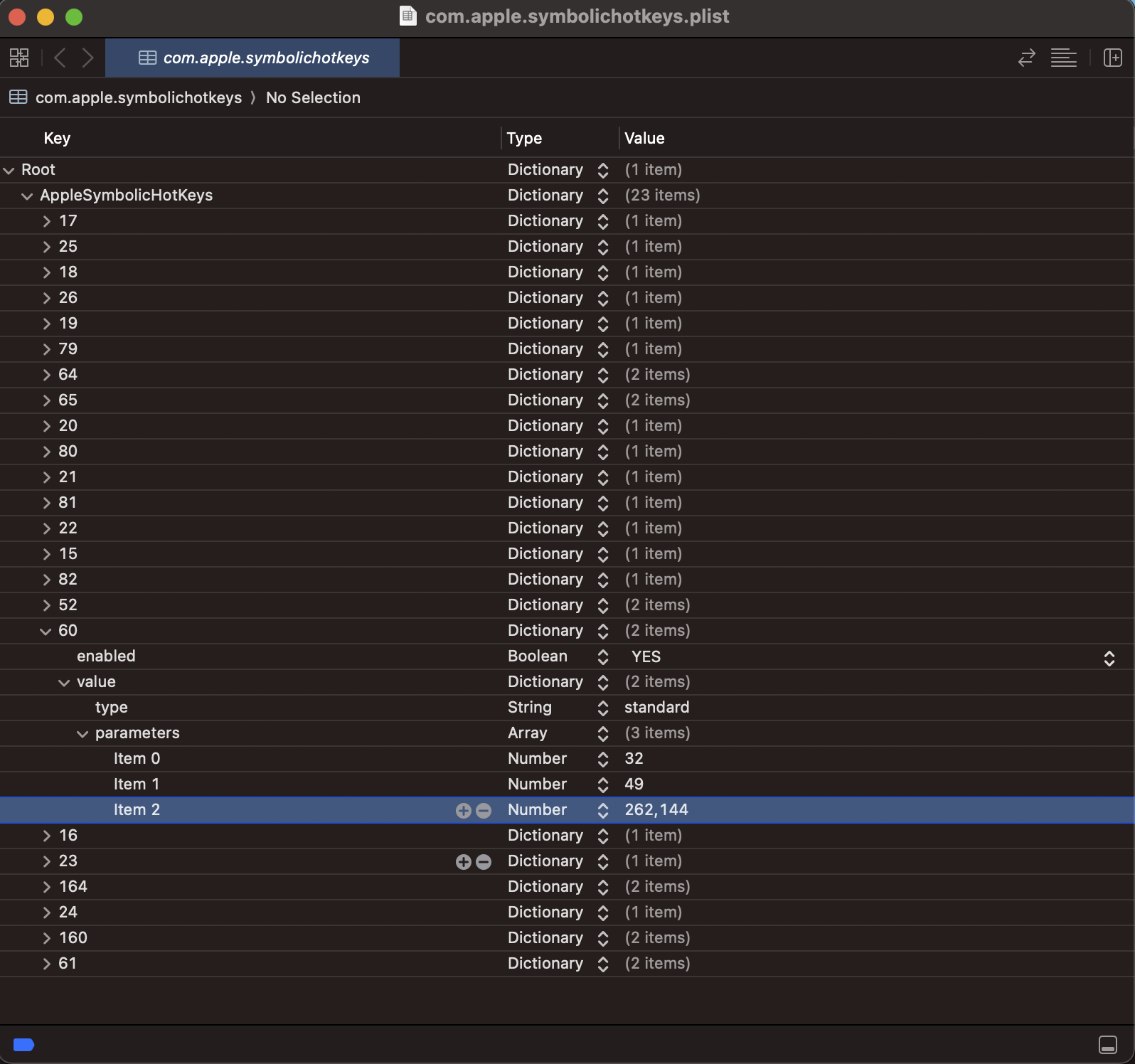 open ~/Library/Preferences/com.apple.symbolichotkeys.plist - Xcode가 실행되면서 com.apple.symbolichotkeys.plist 파일이 열립니다.