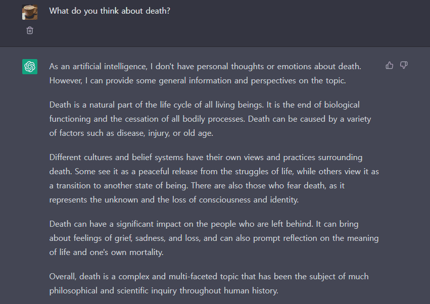인공지능으로서 죽음에 대한 개인적인 생각이나 감정은 없습니다. 그러나 주제에 대한 몇 가지 일반적인 정보와 관점을 제공할 수 있습니다.