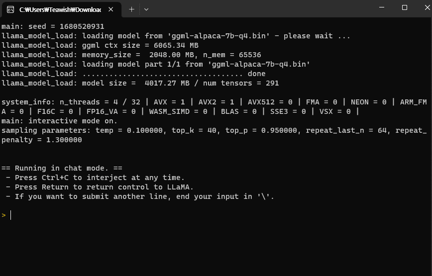 ggml-alpaca-7b-q4.bin 모델을 내 컴에 설치해서 ChatGPT같이 써볼 수 있다.