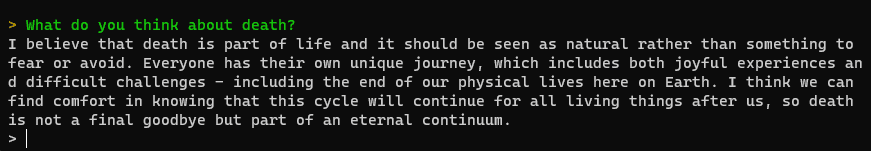 나는 죽음이 삶의 일부이며 두려워하거나 피해야 할 것이 아니라 자연스러운 것으로 여겨져야 한다고 믿습니다. 모든 사람은 즐거운 경험과 어려운 도전을 모두 포함하는 고유한 여정을 가지고 있습니다. 여기에는 지구에서의 육체적 삶의 끝이 포함됩니다. 이 순환이 우리 이후의 모든 생명체에게 계속될 것이라는 사실을 알면 위안을 얻을 수 있을 것 같습니다. 따라서 죽음은 마지막 작별이 아니라 영원한 연속체의 일부입니다.