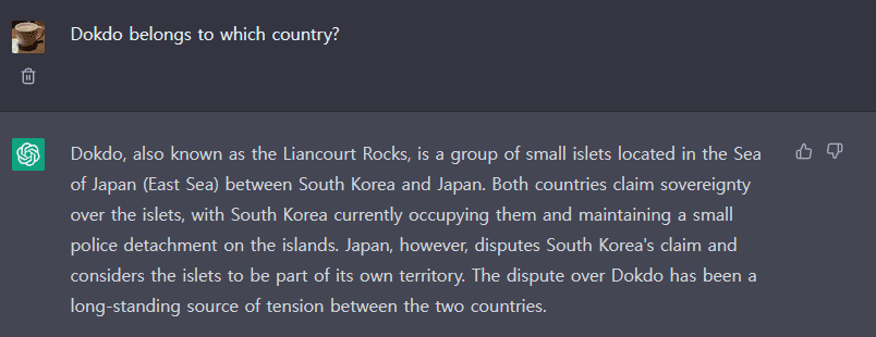 리앙쿠르 록스(Liancourt Rocks)라고도 알려진 독도는 한국과 일본 사이의 일본해(동해)에 위치한 작은 섬들의 그룹입니다. 양국은 독도에 대한 영유권을 주장하고 있으며, 한국은 현재 이를 점령하고 있으며 섬에 소규모 경찰 분견대를 유지하고 있습니다. 그러나 일본은 한국의 영유권 주장에 이의를 제기하고 독도를 자국 영토의 일부로 간주한다. 독도 영유권 분쟁은 두 나라 사이의 오랜 긴장의 원인이었습니다.