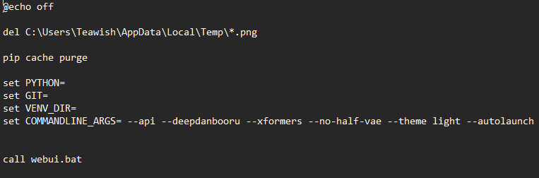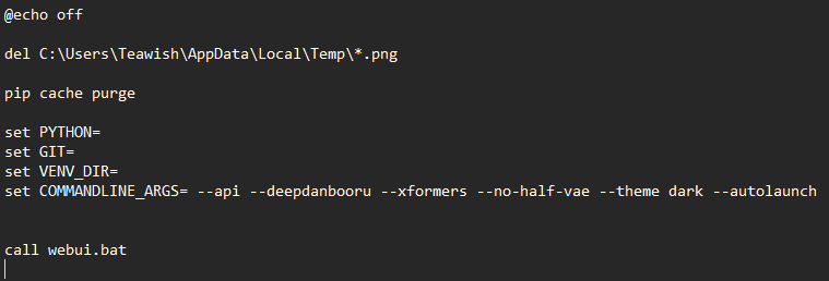 이런 웹브라우저의 셋팅값과 별개로 스테이블 디퓨전을 원하는 모드로 실행할 수 있는데, webui-user.bat에 명령어를 한 줄 써 놓으면 실행할 때마다 원하는 모드로 실행이 된다.
