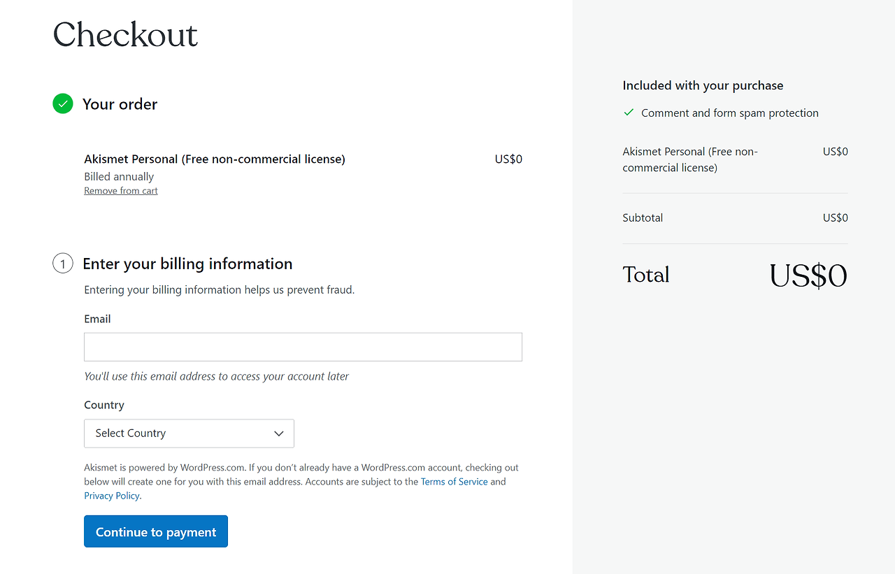 아키스밋은 워드프레스에 기본적으로 설치되어 있는 플러그인이므로 플러그인을 활성화하여 사용할 수 있습니다. 아키스밋을 사용하기 위해서는 워드프레스닷컴 계정이 필요합니다. 계정이 없다면 신규 가입을 통해 계정을 생성하세요.