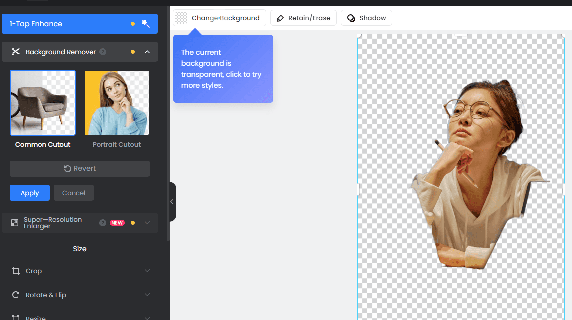 배경 누끼를 따주는 기능도 한번만 눌러주면 바로 적용이 되는데