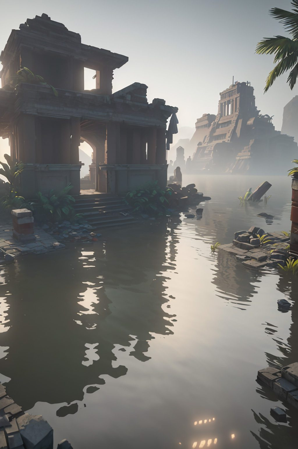 (8k, RAW photo, best quality, masterpiece:1.2), (realistic, photo-realistic:1.37), octane render, ultra high res, ultra-detailed , professional lighting, photon mapping, radiosity, physically-based rendering, ue5, ((island sanctuary)), ((ancient fallen kingdom)), ((reflections in water)), ((raytracing)), ((drowned city))