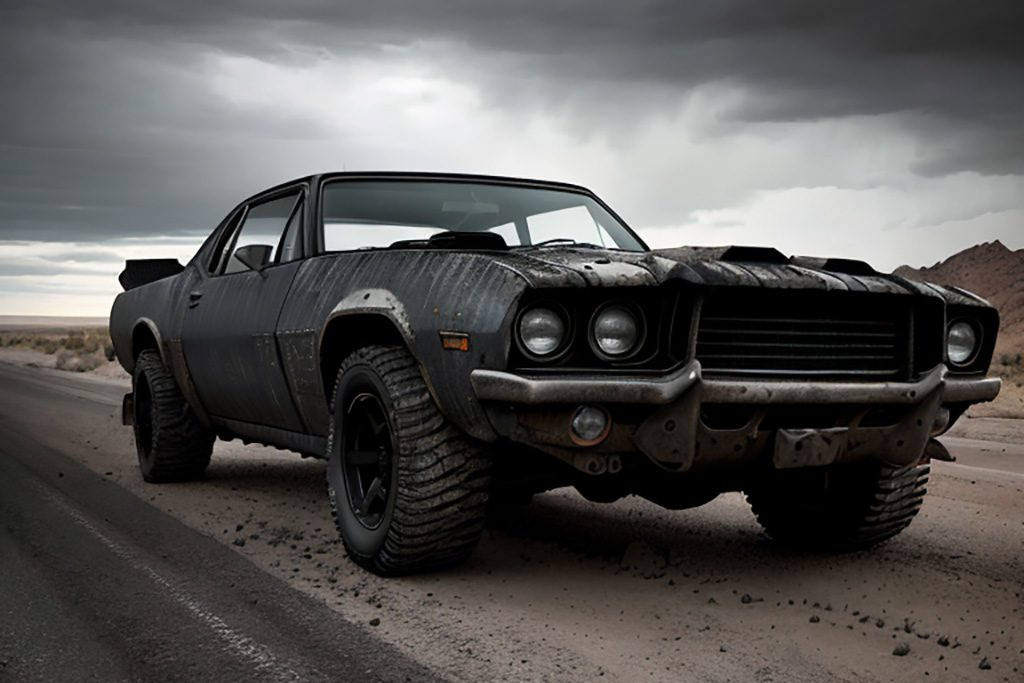 cinematic, filmic image 4k, 8k with [George Miller’s Mad Max style]. The image should be captured in a [wide-angle view] and depict [single] a [post-apocalyptic] V8 [muscle car]. The car’s paint is a [black] covered in a spots of [rust] and thin layer of smooth [dust] and [dirt], making it appear [rugged] and [gritty] but with visible [black color]
