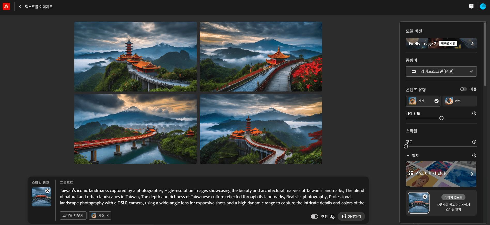 Adobe Firefly는 Adobe 유료 사용자들에게 특별한 이점을 제공하며, 매월 충분한 크레딧을 제공함으로써 업무 활용에 큰 도움이 됩니다. Adobe Firefly의 가장 눈에 띄는 특징 중 하나는 바로 그 포토그래피적인 디테일 표현 능력입니다. 이는 Adobe만의 강점으로, 다른 생성형 AI 플랫폼과 비교할 때 확실히 차별화된 점입니다.