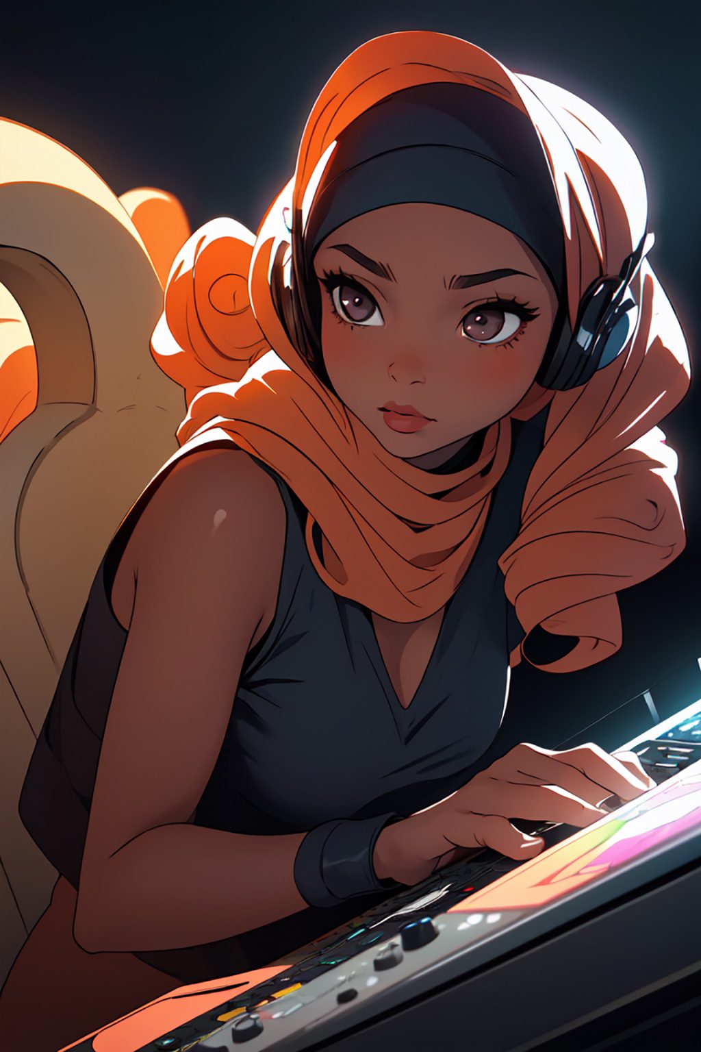 (best quality, masterpiece), 1girl, dj, dark skin, curly hair, hijab, backlighting,