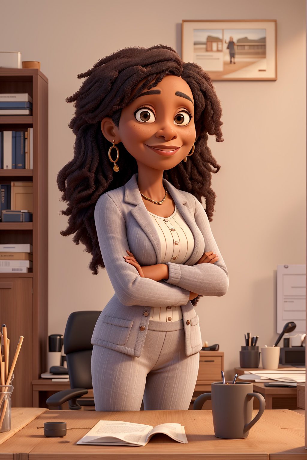 masterpiece, best quality ,Portrait of mid adult successful black mature woman looking at camera with arms crossed. Smiling african american business woman standing in new office .Portrait of mature woman.