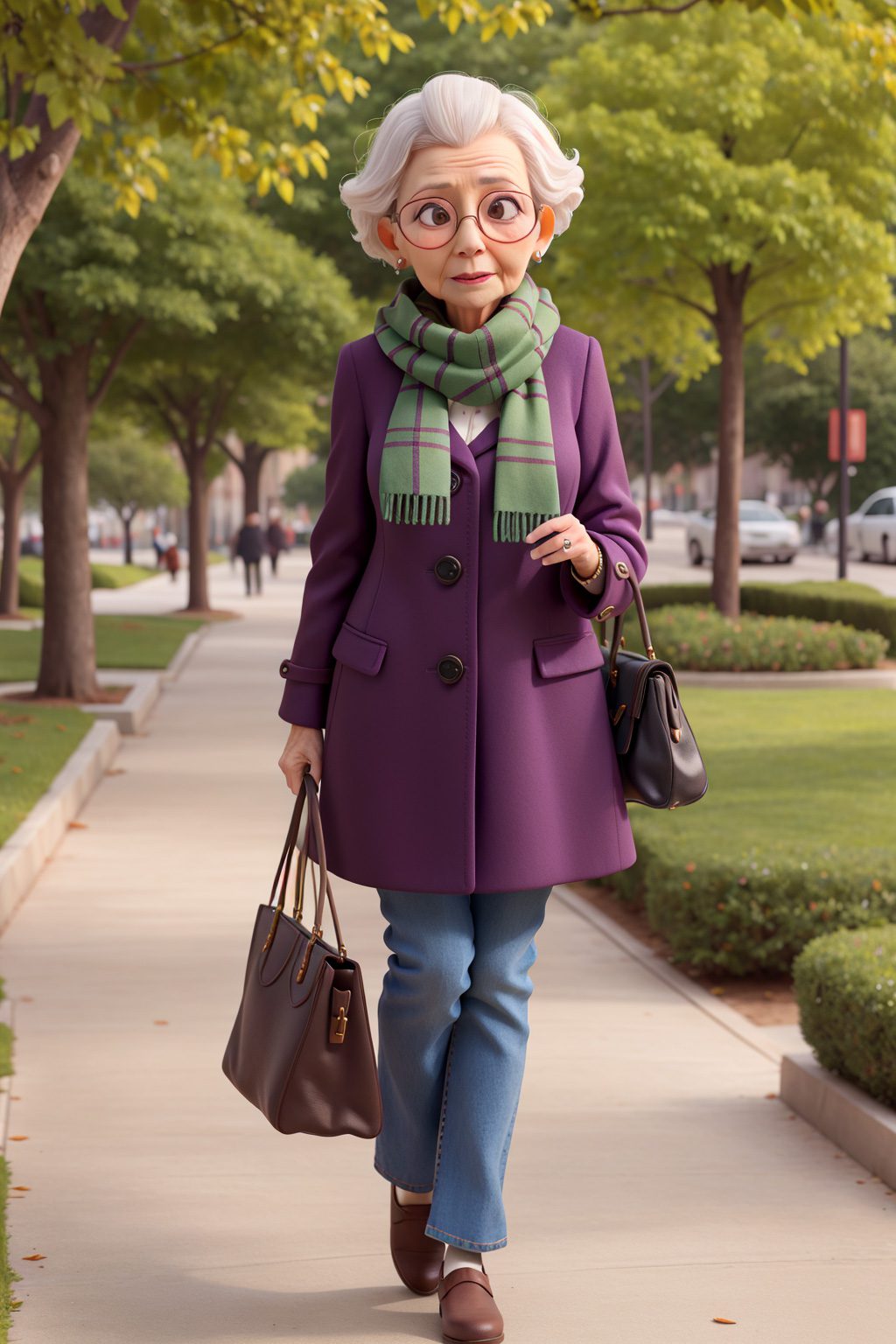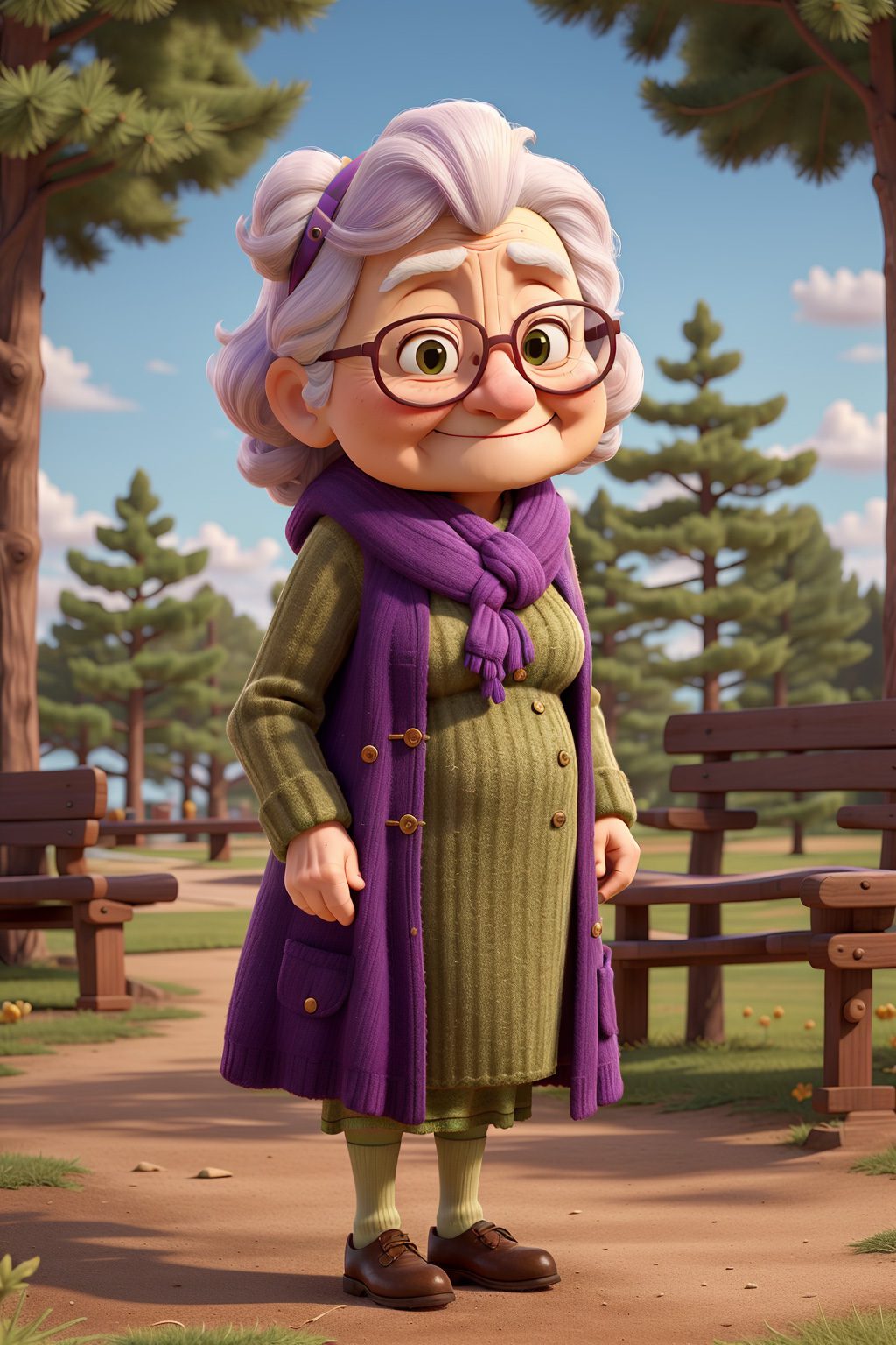 masterpiece, best quality, an old woman with glasses and a scarf on, wearing a purple coat and green scarf, standing at the park