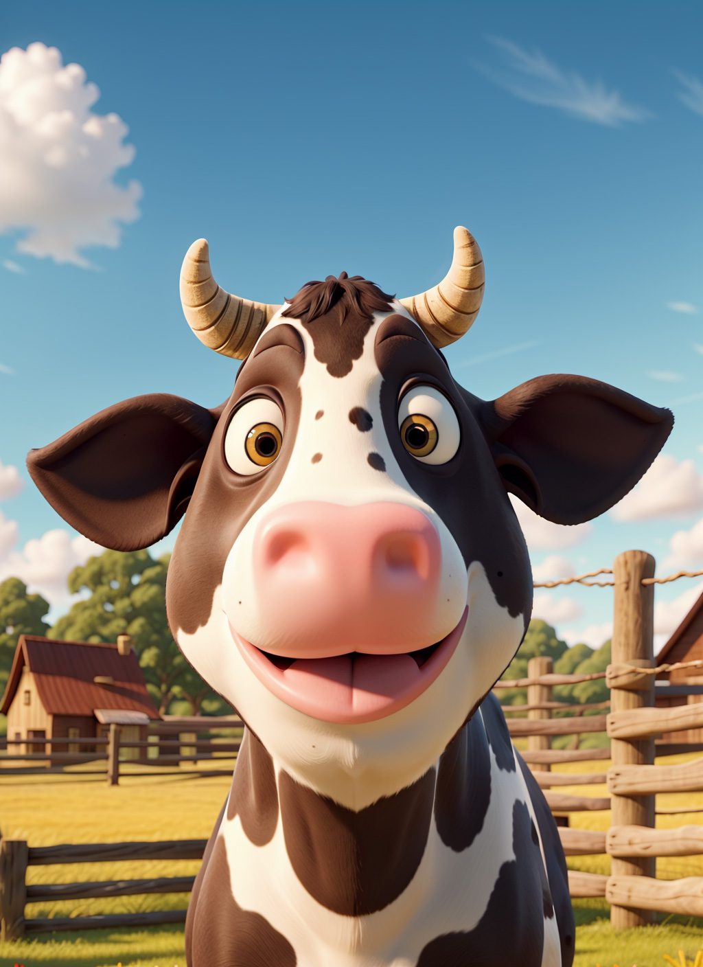 masterpiece, best quality,a close up of holstein friesian cow with a big smile on its face and a fence in the background with a sky and clouds