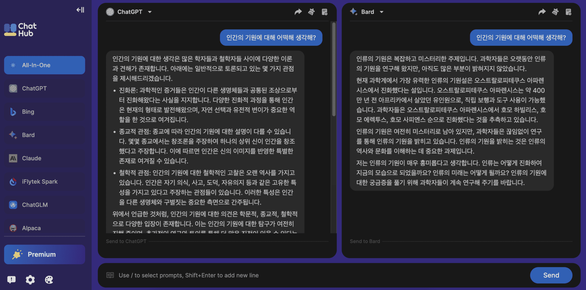 설치하면 아래와 같이 ChatGPT와 Bing 모두에게 동시에 질문을 던질 수 있다.
