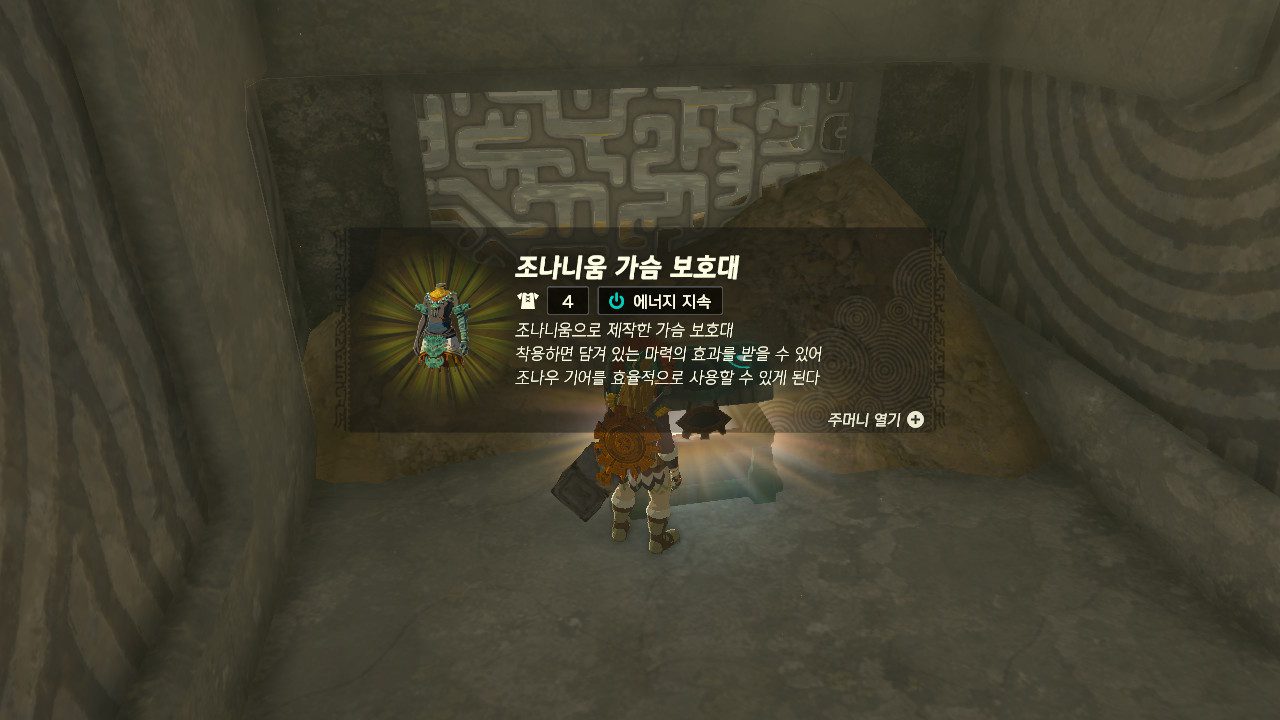 야음사미노의 사당뒤에 보면 용암이 있는 부분에 물화살이나 물을 이용해 발판을 만든뒤 위로 숨겨진 방에 트레루프 하여 올라가야 조나니움 가슴 보호대가 있는 보물상자를 열수 있다.