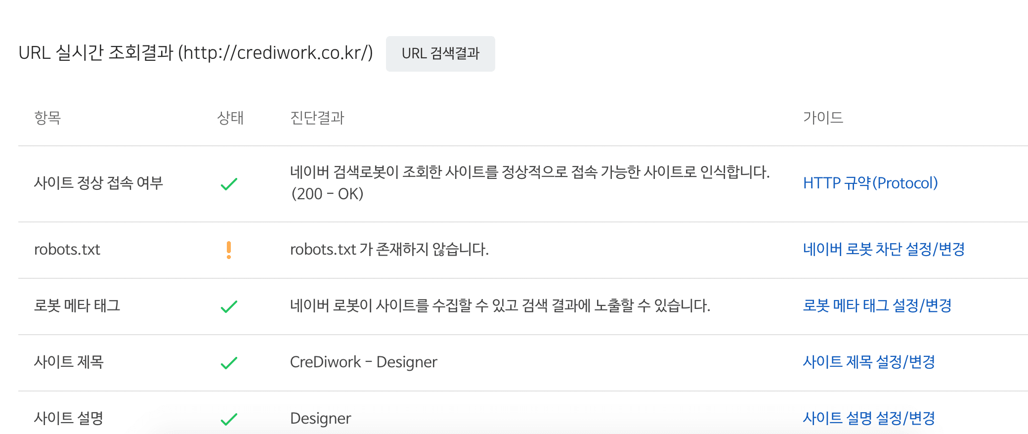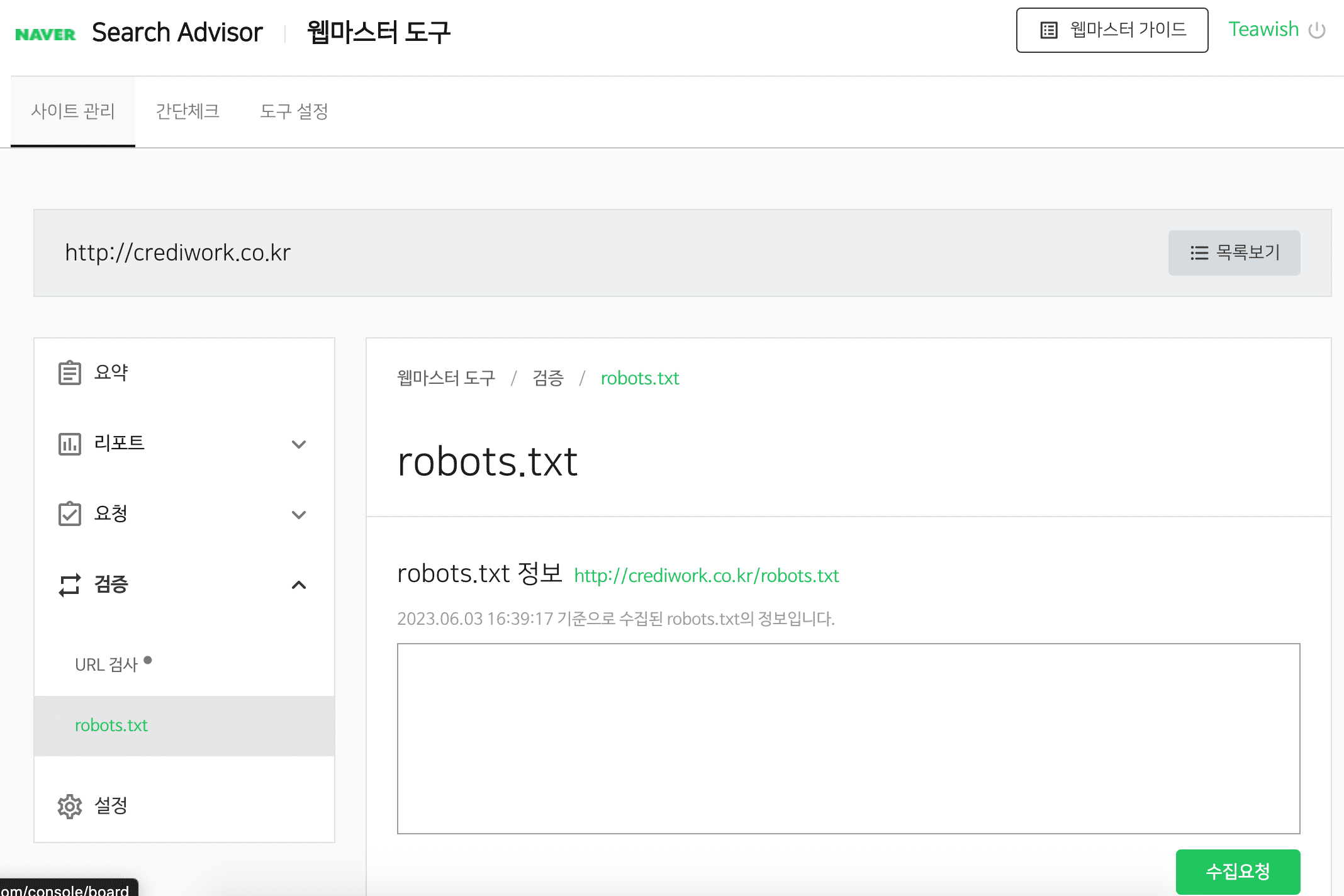 robots.txt가 존재하지 않습니다. 메시지가 나온다면 이렇게 수집요청 한번 하고 다시 체크해 보길~
