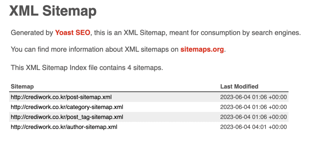 여기서 View the XML sitemap 버튼을 눌러 사이트맵 화면이 잘 나오면 정상 작동되는중인데