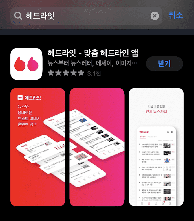 이 뉴스GPT를 서비스하는 매체는 헤드라잇인데, 앱스토어에서 [헤드라잇]을 검색해서 설치해 준다.