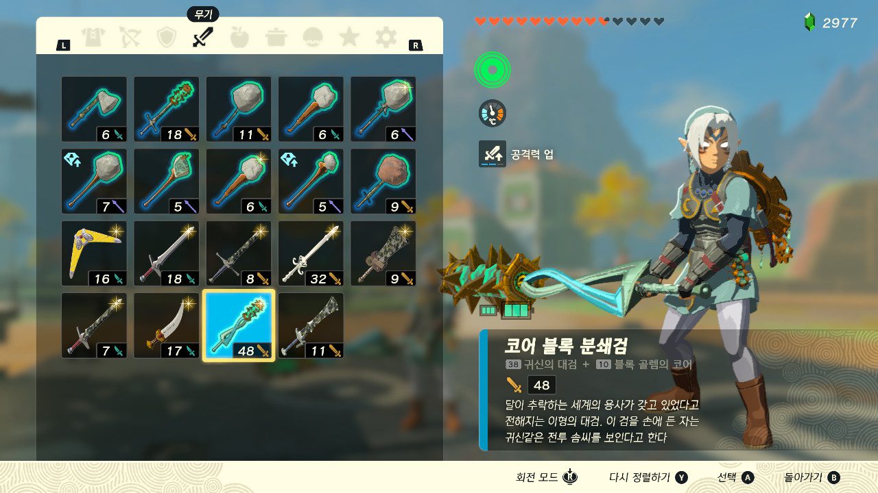 분해한 블록 코어를 38 공격력의 귀신의 대검에 부착하니 +10 공격력이 추가되어 48 공격력의 코어 블록 분쇄검이 탄생했습니다!
