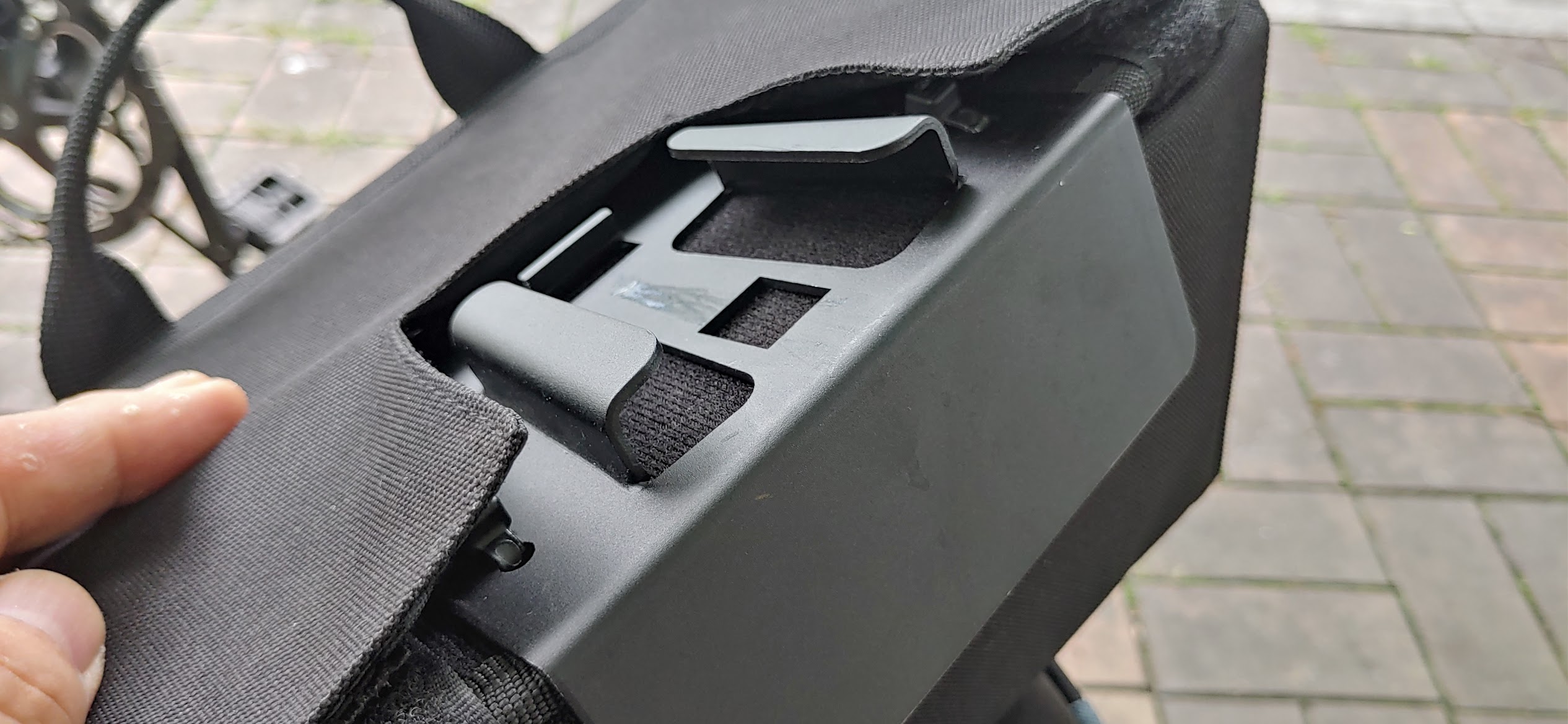 가방 뒤쪽을 보면 브라켓과 고정 부분이 있는데, 플라스틱이 아닌 튼튼한 재질로 제작되어 있어 내구성도 걱정 없을 것 같습니다. 장착 후 라이딩을 해보니 흔들림 없이 단단히 고정되어 있어서 안정감이 느껴졌어요.