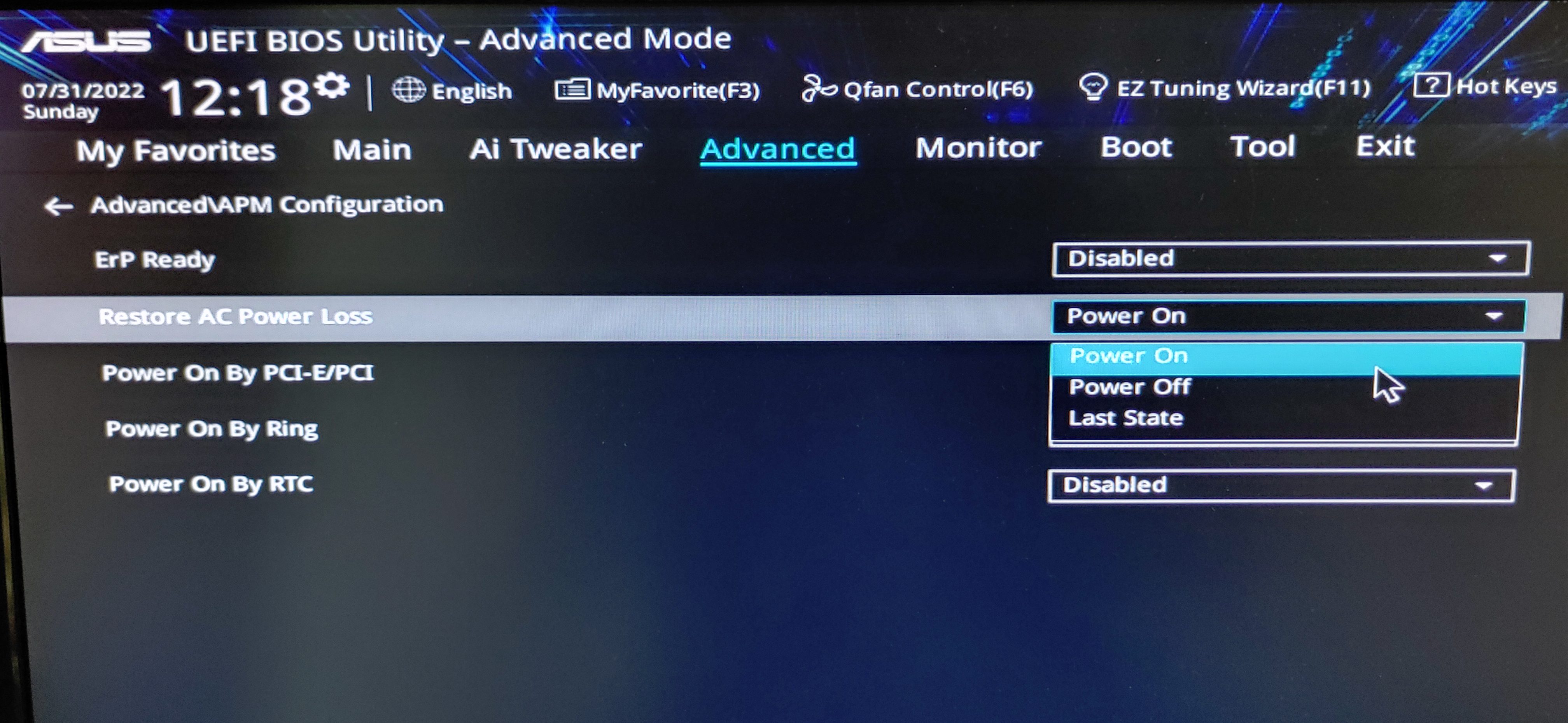 - BIOS → Advanced → Restore AC Power Loss 항목