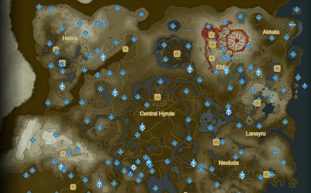 이 지도는 하이랄 전역에 걸쳐 있는 다양한 요소들을 아이콘으로 표시하여 제공합니다: