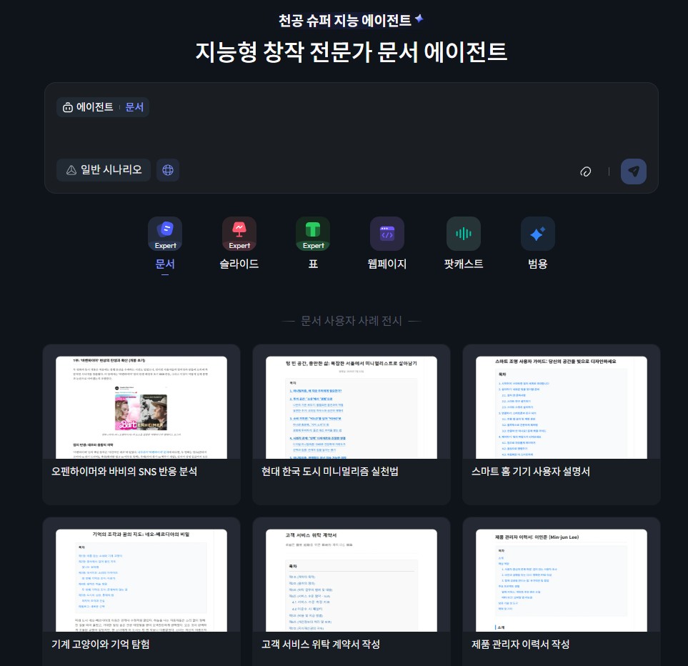 원하는 에이전트를 선택 → 주제와 요구사항 입력 → 즉시 결과 확인.