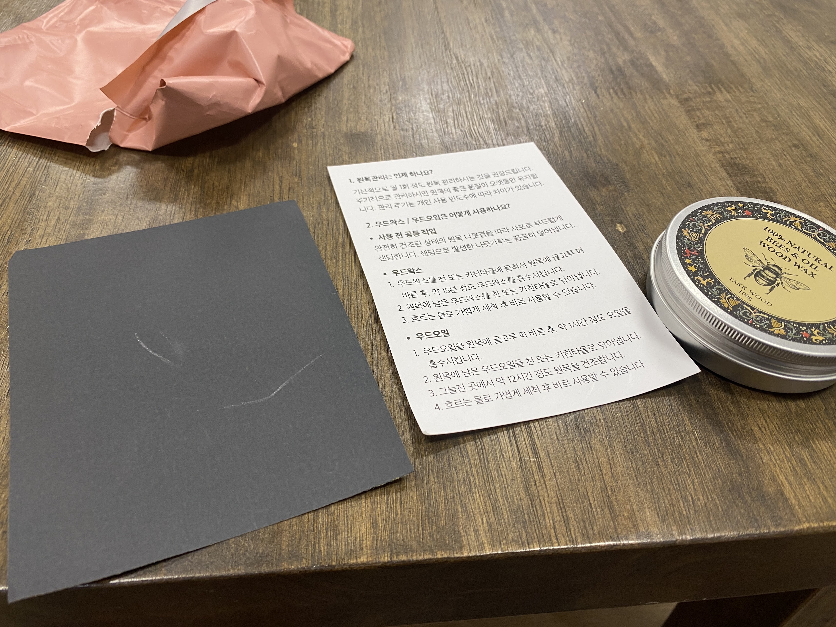 구성품은 간단하지만, 원목 관리에 꼭 필요한 것들이라 초보자도 쉽게 시작할 수 있겠더군요.