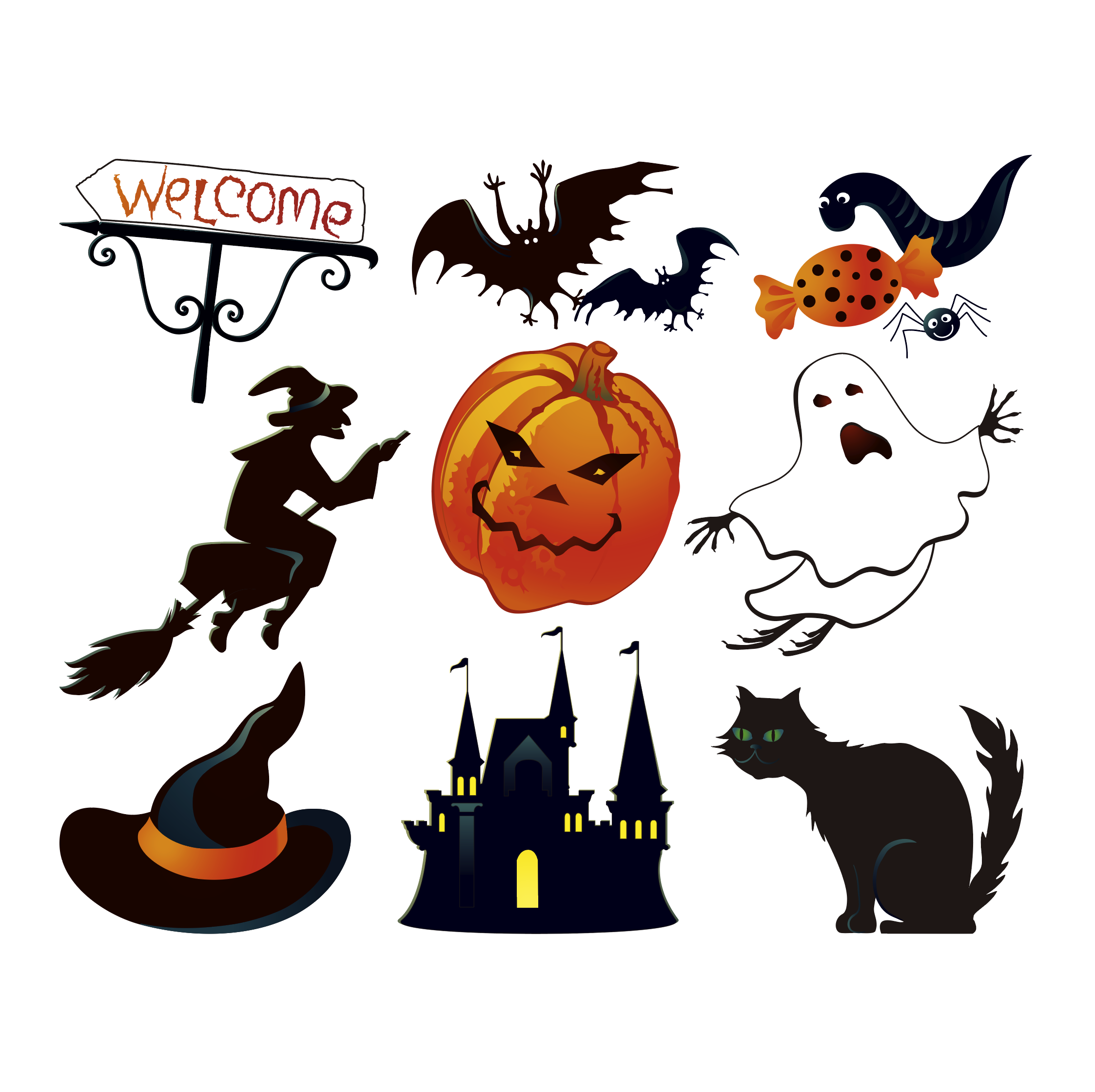 마녀, 유령, 박쥐, 호박, 고양이, 성, 마법모자 등 할로윈 분위기를