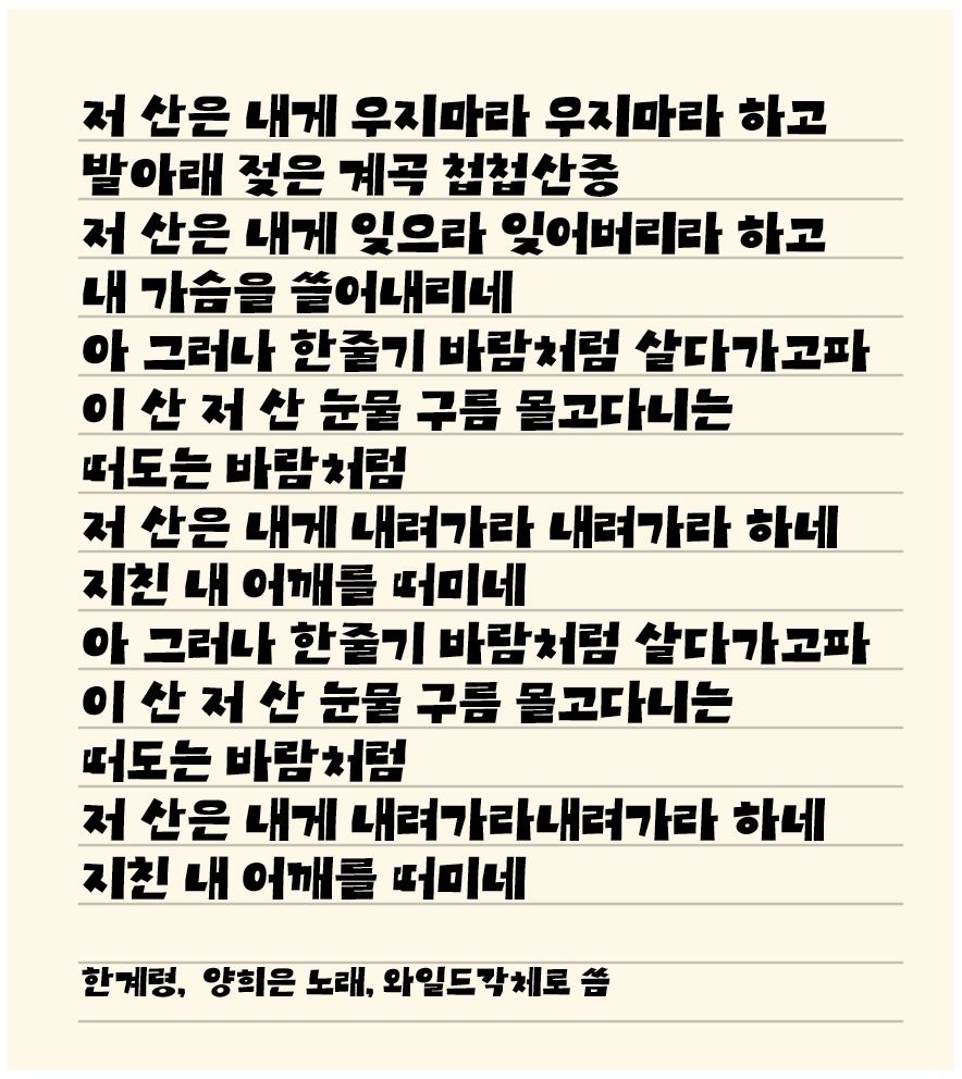 이 서체는 보는 순간 ‘강한 인상과 자유로움’을 동시에 느끼게 합니다.