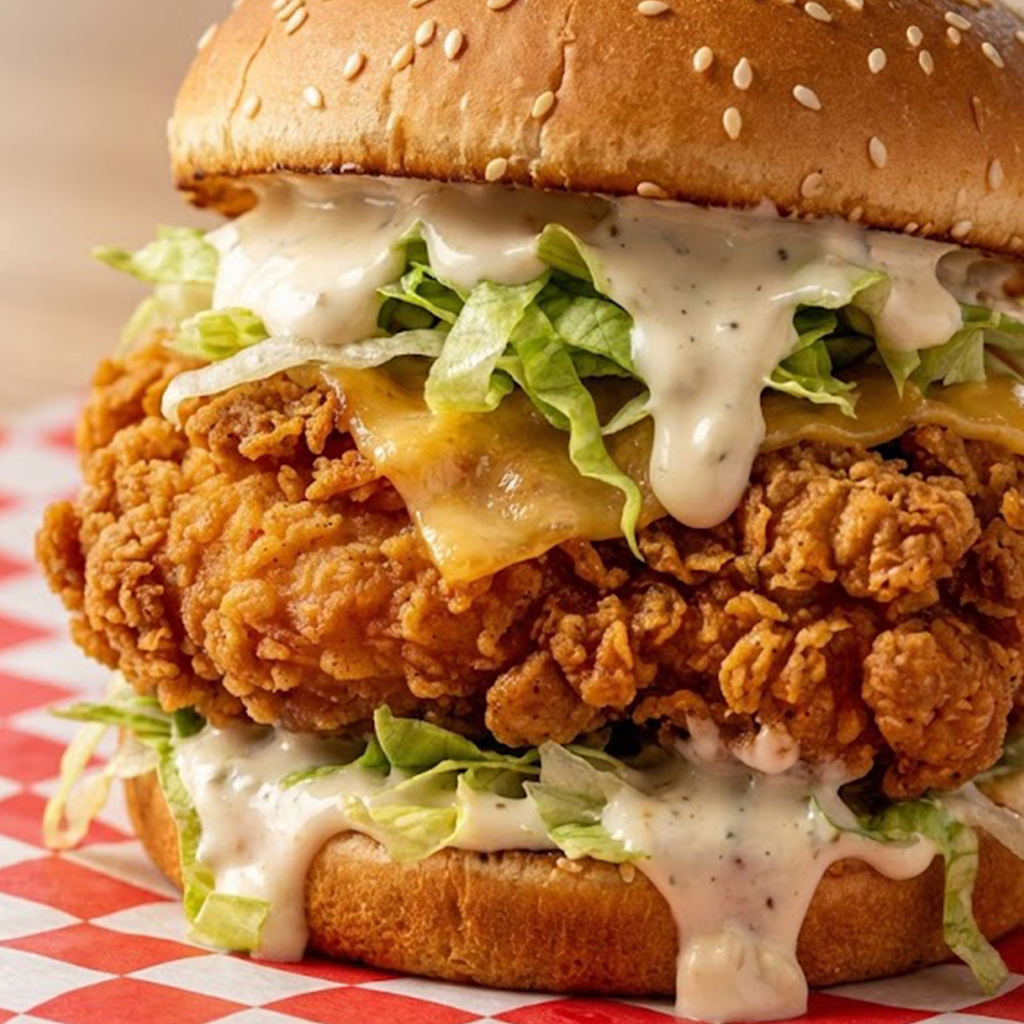 바삭하게 튀겨낸 육즙 가득한 치킨 패티와 그 사이로 흘러내리는 달콤하고